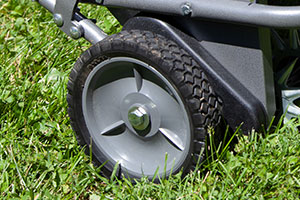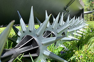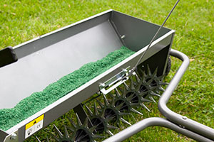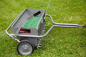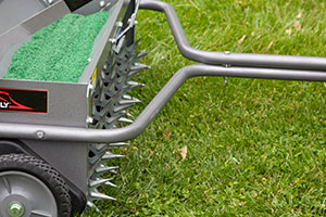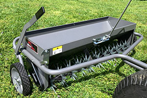 This hard-working tool is built tough with durable tubular steel frame and drawbars. The 100 lb. capacity hopper is made from 18 gauge all-welded steel to minimize twisting and flexing when loaded, while the 8” galvanized steel tine stars stay sharp, won’t rust, and penetrate up to 2 inches to allow air to reach the root system. The calibrated flow control feature includes an adjustable stop to ensure accurate spread patterns with minimal waste while out on the job.