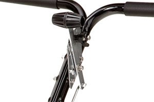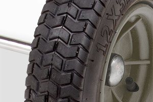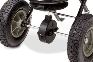 The large 12″ x 3″ pneumatic turf tread tires for long lasting durability and an easy push through the lawn.