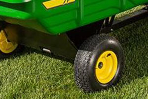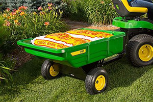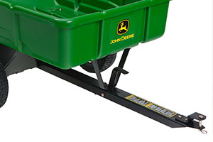 Save time and your back, with this premium molded heavy duty utility cart. John Deere's 7 cu. ft. high-density polyethylene cart easily connects to your lawn tractor using a universal hitch. Perfect for hauling rock, soil, mulch, firewood and tools, this hard-working cart has a load capacity of 450 lbs. The body won't rust or dent and is molded for superior strength and durability. If you want to customize for special projects, this cart features two vertical 3/4 in. molded channels on each side, allowing loads to be divided into multiple compartments. Pneumatic tires provide turf tread for excellent traction, shock absorption and minimal rolling resistance. And the steep tailgate angle and release mechanism make the emptying process a breeze.