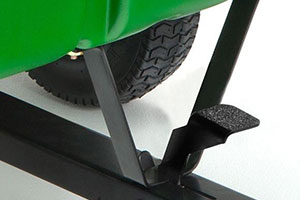 No-slip textured foot pedal for hands-free quick release to empty bed contents. Seamlessly locks back into place after dumping.