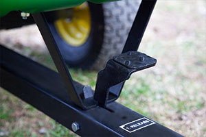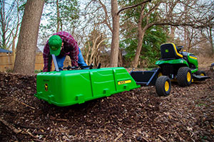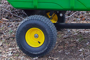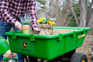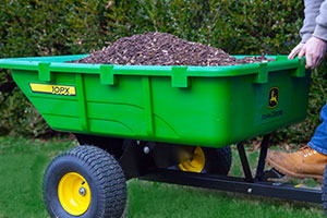 The John Deere PCT-10PXJD tow-behind poly cart features a full 180-dump angle, ensuring material is never left in the bed after unloading. Just engage the hands-free foot pedal, and flip the bed over. It easily locks back into place then it's on to the next job! This John Deere cart is unmatched when it comes to hauling mulch, dirt, firewood, landscaping supplies or virtually anything around your yard or farm. Large pneumatic turf tread tires provide excellent shock absorption and prevent lawn damage, while the steel frame ensures unmatched durability. The thick polypropylene bed is compression-molded for superior strength season after season, and features molded-in slots for DIY bed dividers and wall extensions. Featuring a true 650 lb. hauling capacity, the PCT-10PXJD will withstand even the heaviest of loads.