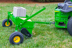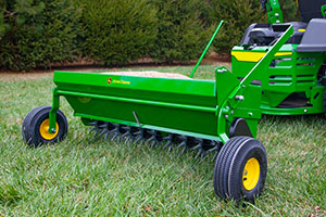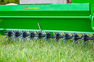 Finish two big lawn projects at once with John Deere's 40 in. Tow-Behind Aerator-Spreader. This time-saving tool not only aerates the soil, allowing water, oxygen and nutrients to reach grass roots, but also drops seed, fertilizer and lime directly into the perforated soil. The durable steel spreader hopper supports up to 100 lbs. of material and features calibrated flow control with adjustable stop features. The aerator's 8 in. diameter powder-coated steel tine stars resist rust and perforate the soil up to 2 in. Multitasking has never been easier!