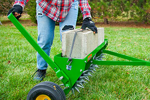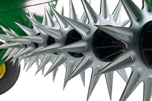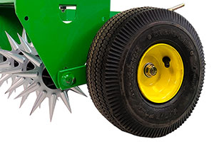 3D formed steel tine stars are built tough - won't break, won't rust. A fully enclosed weight tray provides the most flexibility for adding various types of weights; sized for concrete cinder blocks, for a 100 lb., weight tray capacity to help with aggressive operations. Eleven (11) 10" diameter galvanized steel stars with 132 tips penetrate the soil to allow nutrients to reach the root system. Engaging the transport wheels allow passage over paved areas with ease.