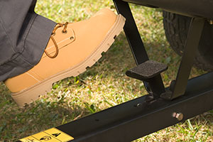 Hands-free steel dump pedal release located on the trailer tongue provides quick release to empty bed contents, and locks back into trailering position when not emptying.